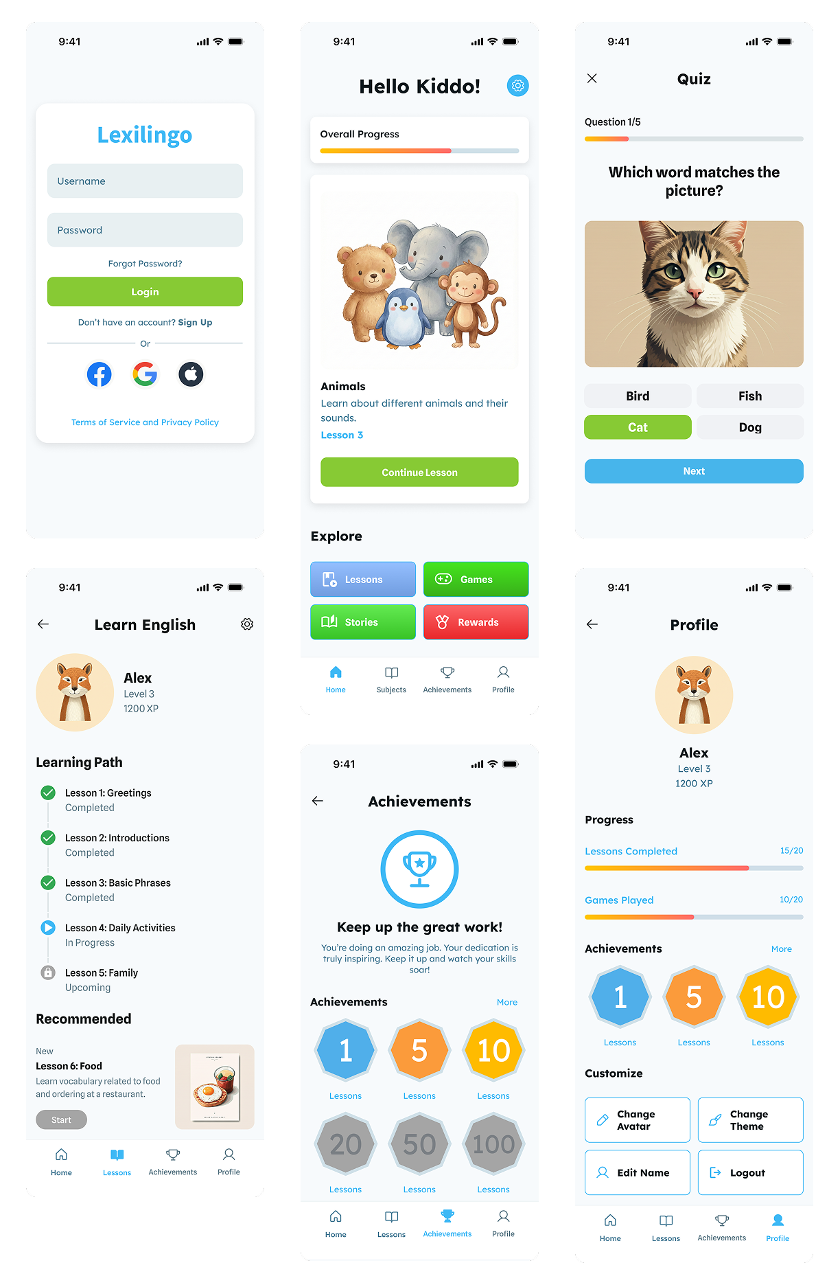Lexilingo is a playful language-learning app designed for kids, built with a friendly visual system and clear learning paths. The app combines lessons, games, quizzes, achievements, and character customization to keep children engaged while building vocabulary and confidence. Each screen is designed to feel intuitive, warm, and rewarding; turning language learning into a fun daily adventure.