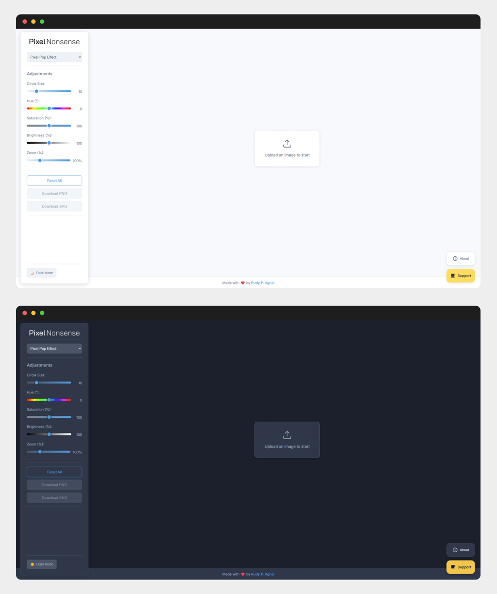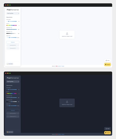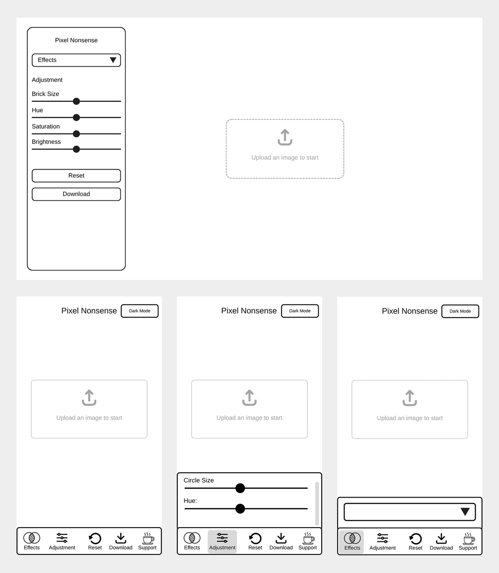 The initial minimal experiment, Brick It!, was intentionally pushed through a rigorous design process. Crucially, I created a wireframe for a joke app —my way of applying premium design rigor ("make it good stupid"). This allowed the concept to be rebuilt with structural integrity into PixelNonsense, adding superior mobile experience, dark mode, and enhanced visual effects.