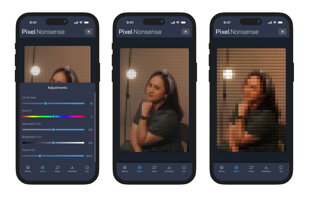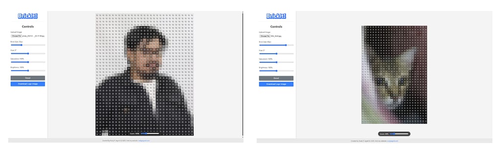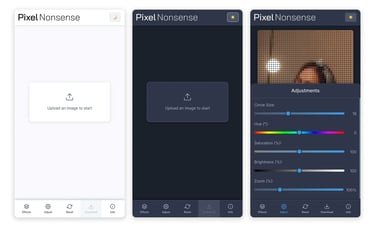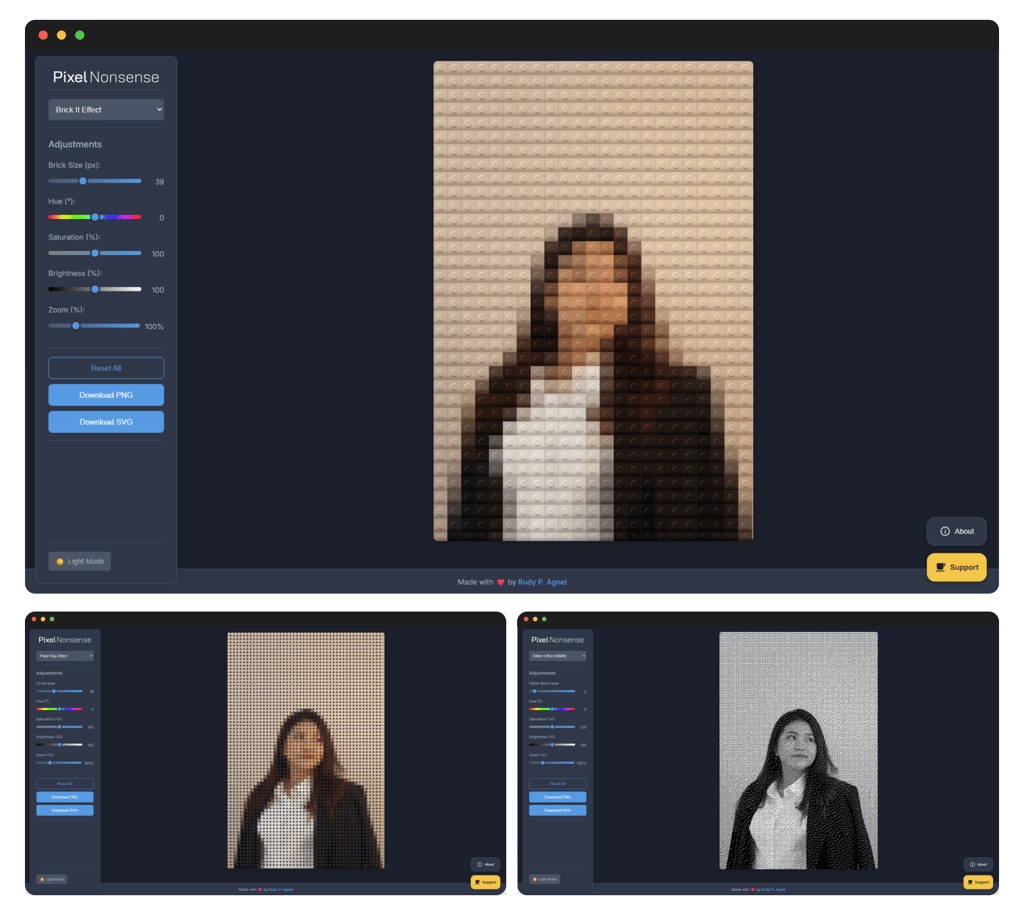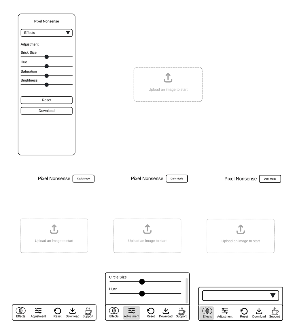 Every app has an origin story, even the silly ones. Before it was PixelNonsense, it lived as a barebones experiment called Brick It!. Brick It! was as minimal as it gets, an effect: a circle pixelation filter. Light mode only (sorry, night owls).No mobile version.A flat “brick” look that felt more like a placeholder than a finished effect. Basically, it was the MVP of nonsense. Functional, funny, but not much more. Then I did something ridiculous: I wireframed the whole thing. Yes, a wireframe for a joke app. That was my way of saying, “Okay, this might be stupid, but let’s at least make it good stupid.”From there, I pushed it through Google Gemini 2.5 Pro and vibe-coded my way into version two: PixelNonsense.This time, it came with upgrade effects instead of one, including a Lego-brick-ish mode with drop shadows and a 3D look. A smoother mobile and desktop experience. Dark mode, because who are we kidding, we all live in dark mode.