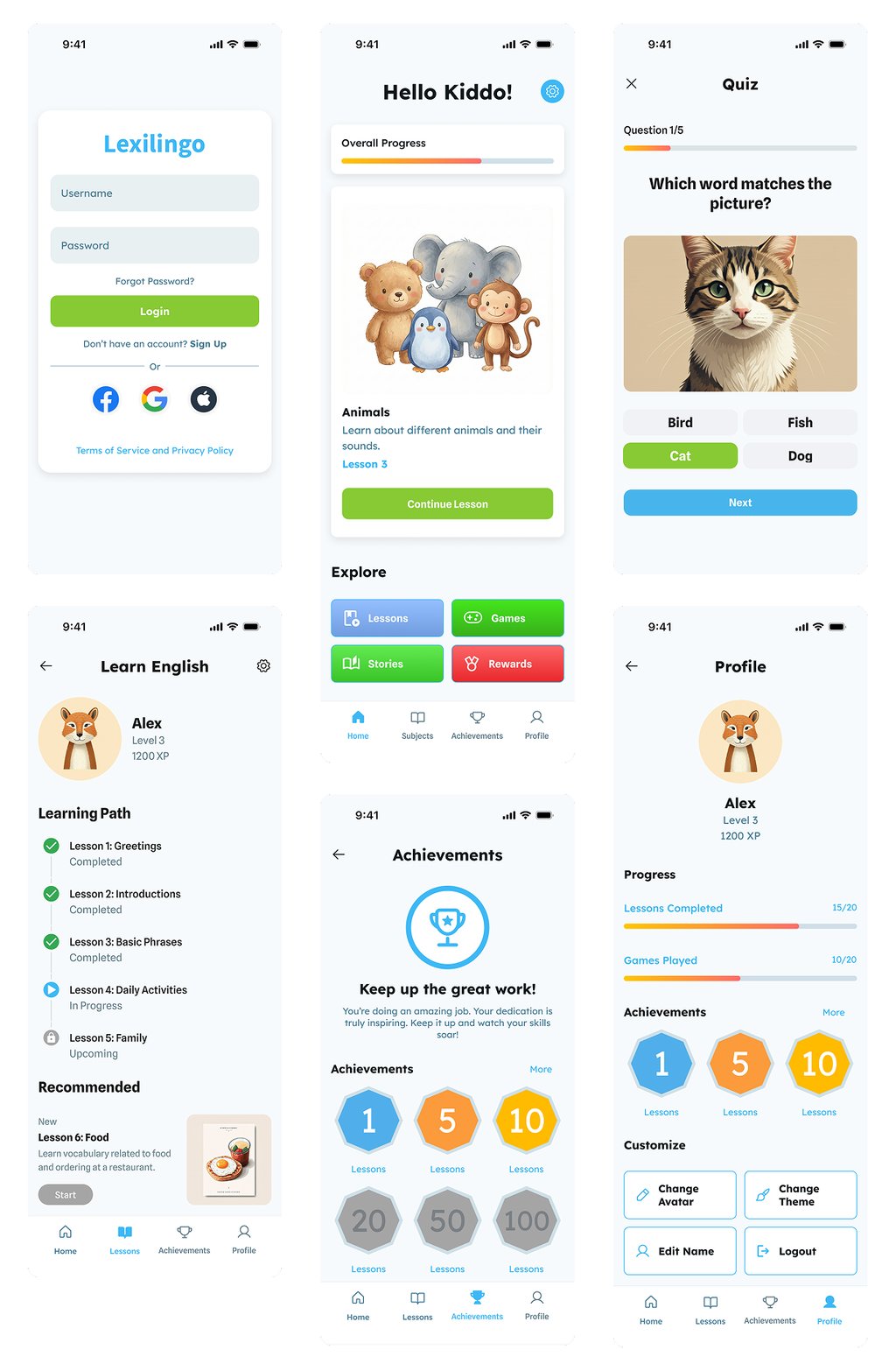 Lexilingo is a playful language-learning app designed for kids, built with a friendly visual system and clear learning paths. The app combines lessons, games, quizzes, achievements, and character customization to keep children engaged while building vocabulary and confidence. Each screen is designed to feel intuitive, warm, and rewarding, turning language learning into a fun daily adventure.